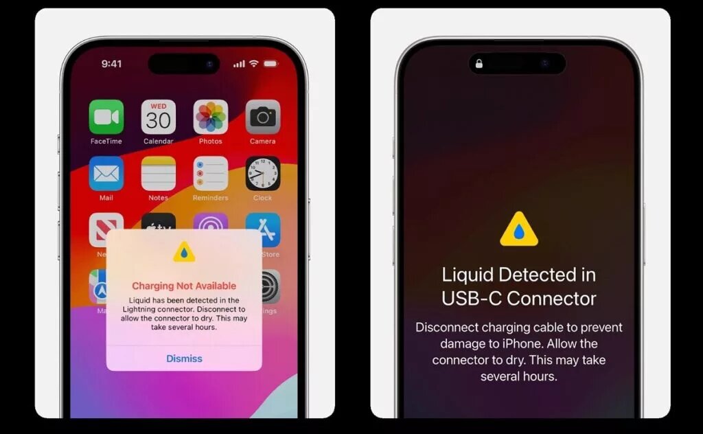 اپل در سایت خود مینویسد که درصورت خیسشدن آیفون یا لوازم جانبی، در ابتدا اگر کابل یا لوازم جانبی به آیفون وصل است، آنها را از گوشی جدا کنید و تا زمانی که گوشی کاملاً خشک نشده است، آن را به کابل برق وصل نکنید.